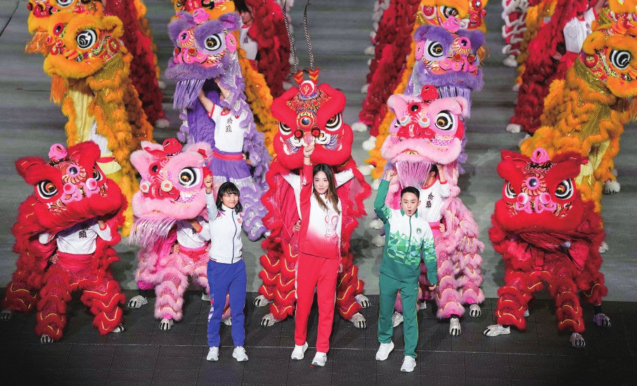 11月21日,广东队运动员王欣瑜(前中)、香港队运动员李思颖(前左)、澳门队运动员郭建恒在闭幕式现场。 新华社记者夏一方摄