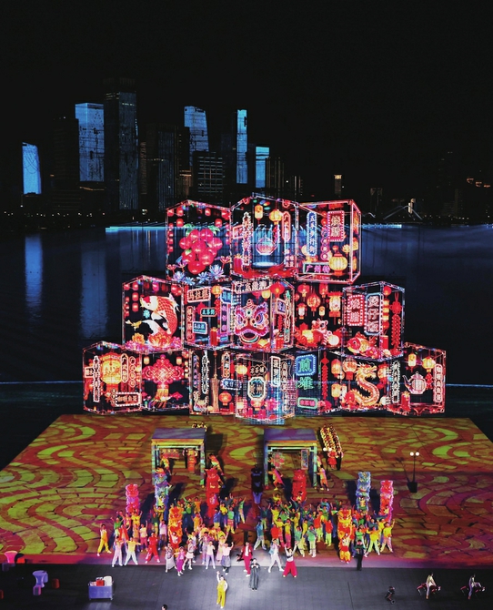舞台上,象征改革开放历程的建设者们接力登场,劈山跨海,筑路架桥。他们带着梦想南下,以敢闯敢试、敢为人先、埋头苦干的特区精神,闯出一片新天地。