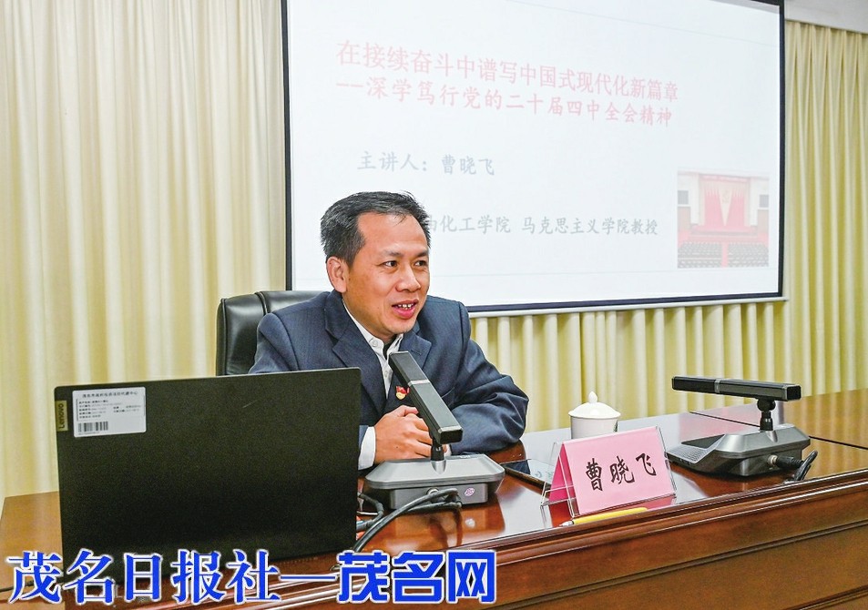 茂名市委学习贯彻党的二十届四中全会精神宣讲团成员、广东石油化工学院马克思主义学院副院长、教授曹晓飞作专题宣讲。茂名日报社全媒体记者 周泽佳 摄