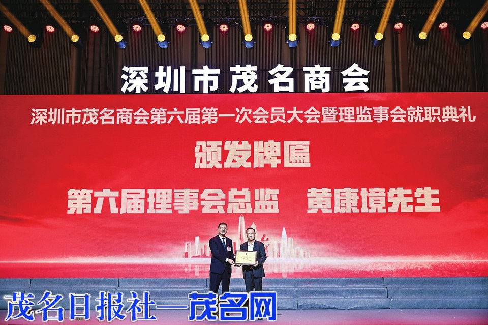 会场细节处处浸润茂商的“根”与“魂”:入口处的“茂商奋斗历程展”,用老照片与关键数据串联起2015至2025的十年蝶变;电子屏上,好心茂名的滨海风情与鹏城深圳的摩天轮廓交替闪现,深茂两地的发展共鸣扑面而来。随着激昂的《国歌》奏响,全体与会者肃立高歌,国旗飘扬间,就职典礼正式拉开帷幕。
