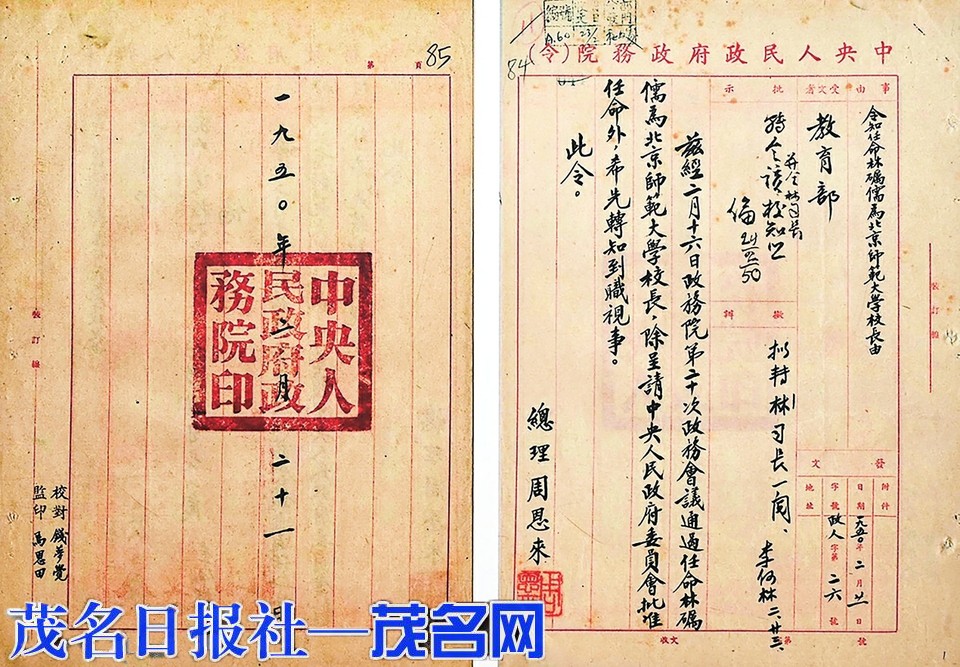 中央人民政府任命林砺儒担任北京师范大学校长一职,由周恩来总理签发任令。