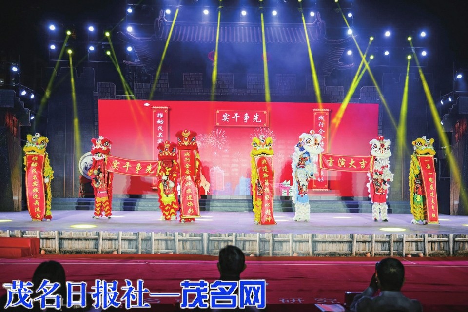 活动在气势恢宏的“八狮献瑞”中拉开帷幕。八头醒狮自观众席奔腾而出,于舞台中央以传统“吐字”形式呈现两幅巨联。“一舞一魂展冼太气概,非遗新篇扬好心精神”,道出了两部作品的精神内核;“践行全会精神,非遗焕彩;推动茂名实践,冼舞流芳”,则昭示了活动的时代意义。狮舞欢腾,彩烟齐放,瞬间点燃全场热情。