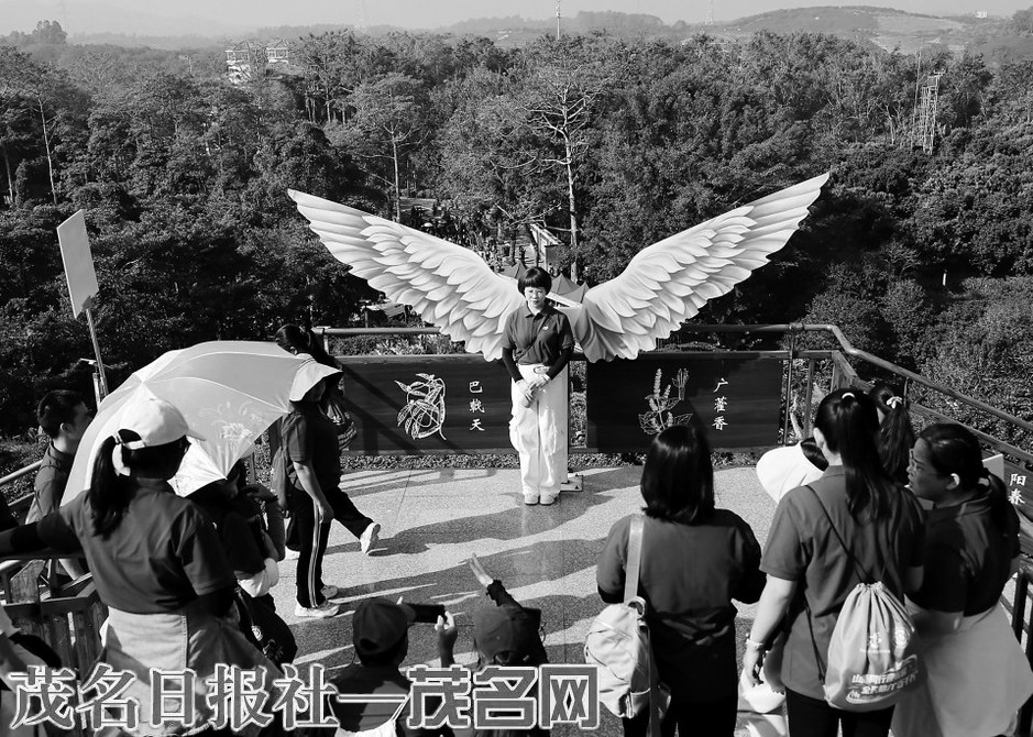 沿着清晰的线路指示牌前行,穿过绿树林荫小道,徒步者来到了首个特色景点油茶博物馆。博物馆四周绽放的红山茶花、白柴籽花,让大家纷纷化为“花蝴蝶”上前欣赏、闻香或拍照。继续前行,徒步者深入50000平方米的种植大棚,近距离观赏特色南药,领略现代南药种植与农光互补的科技魅力;在“24节气”药亭登高望远,一览绿树红花的自然景色,尽赏热带农业与南药美好风光;到达中央广场,又甜蜜打卡特色婚姻户外登记颁证点,“沉浸式”感受新时代的文明婚尚。一对中年夫妻在白色爱情阶梯上合影后,马上通过微信分享给家人。他们说:“现在茂名有很多个特色婚姻户外登记颁证点,很有仪式感,又新潮简单,值得推广。”