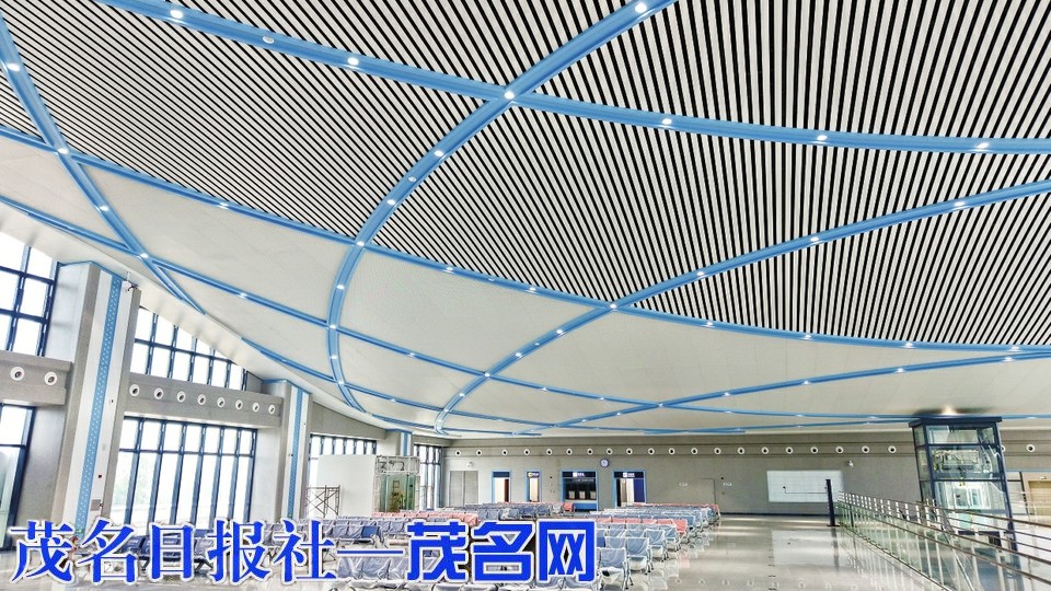 走进候车大厅,仿佛踏入一幅流动的海洋画卷。蓝白交织的色调清新雅致,带来海风拂面般的舒适惬意。一楼吊顶的“星辰大海”波浪线条灵动舒展,二楼“渔光织梦”的弧形设计,既大气美观,又巧妙呼应茂名拥有“广东第一大渔港”的城市名片。坐在候车厅中,静静地朝窗外看去,弧形玻璃幕墙将天光与城市风景温柔纳入,既节能环保,又营造出通透开阔的空间意境。