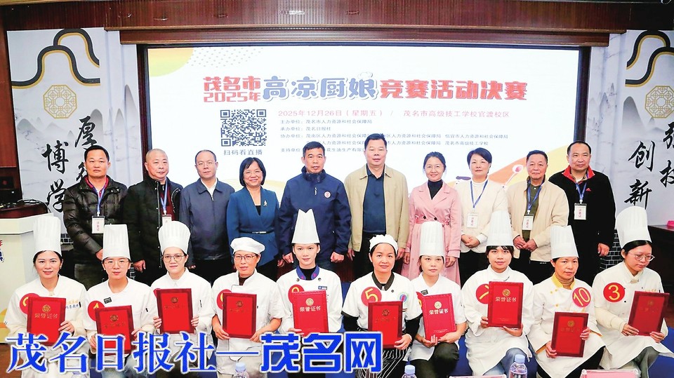 本报讯12月26日,茂名市2025年“高凉厨娘”竞赛活动决赛在茂名市高级技工学校官渡校区举行。来自茂南、电白、信宜、高州、化州五大赛区的十位选手齐聚一堂,同台竞技,共同展现了高凉菜系的独特魅力与深厚文化底蕴。