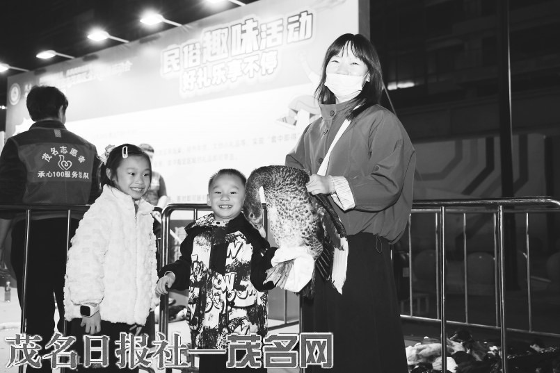 夜幕降临,民俗趣味套圈活动准时开启,市民排队参与,有人成功套中茂南本地鸭,从志愿者手中接过奖品时笑容灿烂。据了解,套圈圈、猜谜等趣味游戏将在28日19:00–21:00持续开放,海量奖品等待市民瓜分。