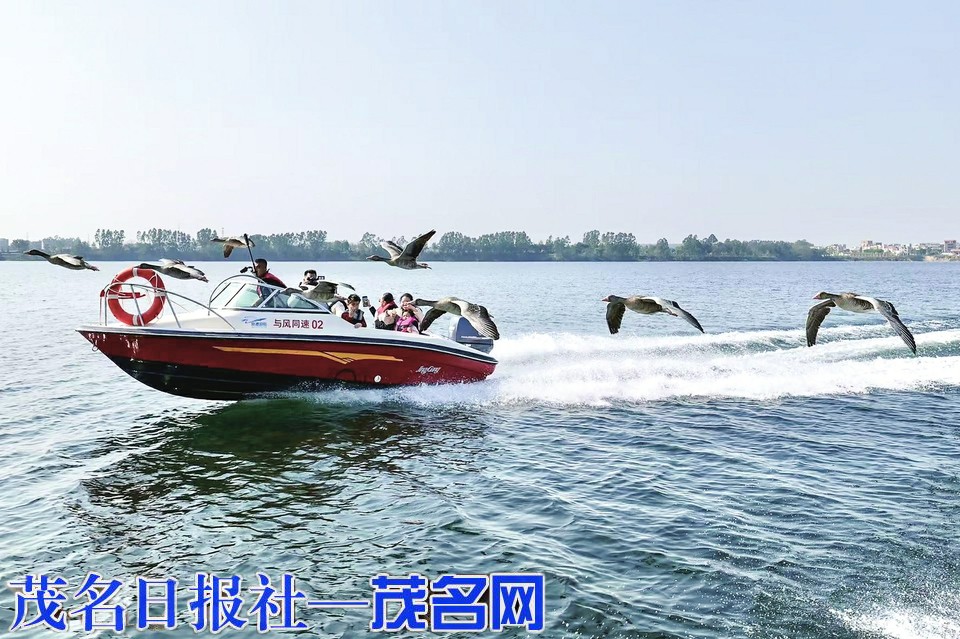 最引人瞩目的,当属1月1日正式启航的“雁遇好心湖·大雁伴您飞”创意文旅项目。作为粤西地区乃至华南首个以“快艇追雁、雁群伴飞”为特色的沉浸式生态体验项目,它一经推出便收获了市民游客的广泛青睐。成群的大雁展翅翱翔,与快艇伴飞前行,乘坐快艇的游客近距离观赏雁群翩跹的身姿,沉浸式感受人与自然和谐共生的独特魅力。