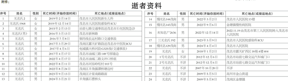 根据《广东省民政厅遗体火化管理工作暂行规定》(粤民福〔2005〕50号)及广东省民政厅、公安厅等9部门关于无人认领遗体处理工作操作指引等规定,现对24具无名氏在我馆冷藏超期保存遗体的资料在《茂名日报》公告(详见附件),自公告之日起60个自然日内,请有关单位(组织)或亲属前来办理逝者的遗体火化事宜,逾期不办理,我馆将按有关规定对遗体火化处理。