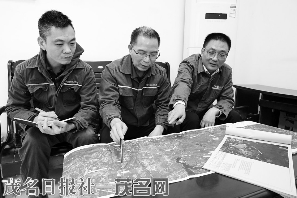 温锦涛(中)与同事商讨新建线路规划建设。通讯员黄琦之摄