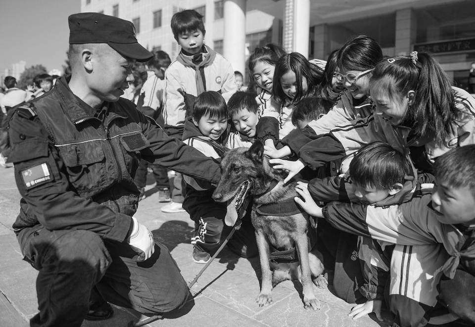 ▲在湖南省永州市道县公安局警营开放日活动上,学生们近距离接触警犬。 新华社发(蒋克青摄)