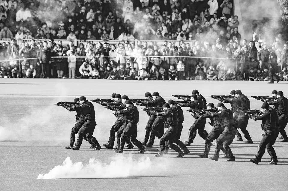 市民在观看防暴枪操演练。新华社发(时宽兵 摄)