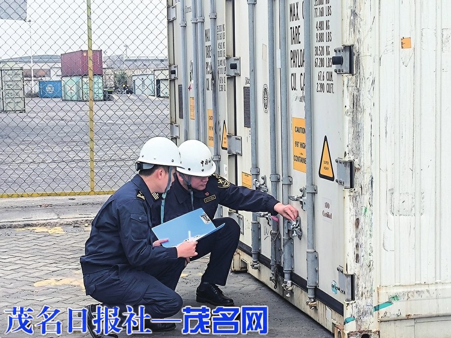 茂名海关关员对一票进口转关冻柜货物进行封志号检查。通讯员 陈酉静 摄
