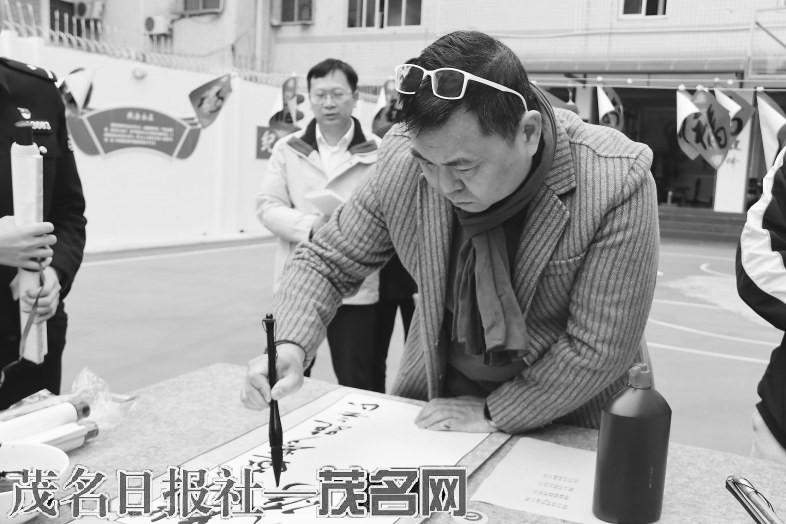 本报讯 日前,茂名边检站营区内墨香氤氲、气氛热烈,一场以“翰墨飘香进警营,文化润心促交流”为主题的文化交流活动在这里举行。应该站邀请,驻地书法家与多家企业单位的书法爱好者走进警营,与民警一同挥毫泼墨,在笔墨流转间搭建起一座文化交流的桥梁(如下图)。