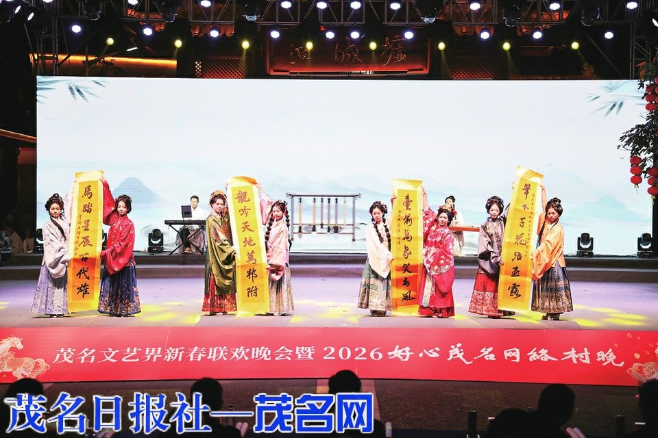 《墨舞霓裳·弦上春》节目则将传统书画艺术与器乐演奏、汉服展演有机融合,身穿精美汉服的演员们缓缓登场,呈现本土书画家的作品,实现了艺术的雅俗共享。佳丽歌舞秀《千年的祈愿》则由多名荔枝文化形象大使与舞蹈演员联袂演绎,诉说着对家乡的热爱与祝福。晚会最后,大歌舞《一起幸福》隆重登场,全体演员同台献艺,寄托着对茂名高质量发展的美好祈愿,祝愿茂名越来越好、市民幸福安康,也为整场晚会画上了一个圆满的句号。