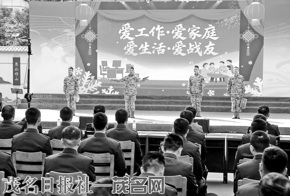 由武警茂名支队与茂南洪拳研究会演绎的《响鼓重锤迎新春》震撼开场,省级非遗项目茂南洪拳与军队擒敌术的完美结合,点燃了全场激情。随后21个精心编排的节目依次上演,围绕军人同心、携手奋进的主题展开,看点十足。三句半《“四爱”谱新篇》别开生面,武警战士们以诙谐幽默的方式讲述军民共建家园的动人故事;场景表演《英雄赞歌》歌颂无私奉献、为国牺牲的志愿军战士们;现代舞《奔跑的青春》展现了武警官兵们的朝气活力;《茂南单人木偶戏歌》让在场官兵、军属近距离领略到茂名非遗文化的独特魅力;情景配音秀《主角与配角》之关税谈判既有时事触角,又有部队内涵;小品《新兵日子》、朗诵《薪火照茂名精神永相传——争做东江纵队传人》等节目展现了军人忠诚底色与家国担当。