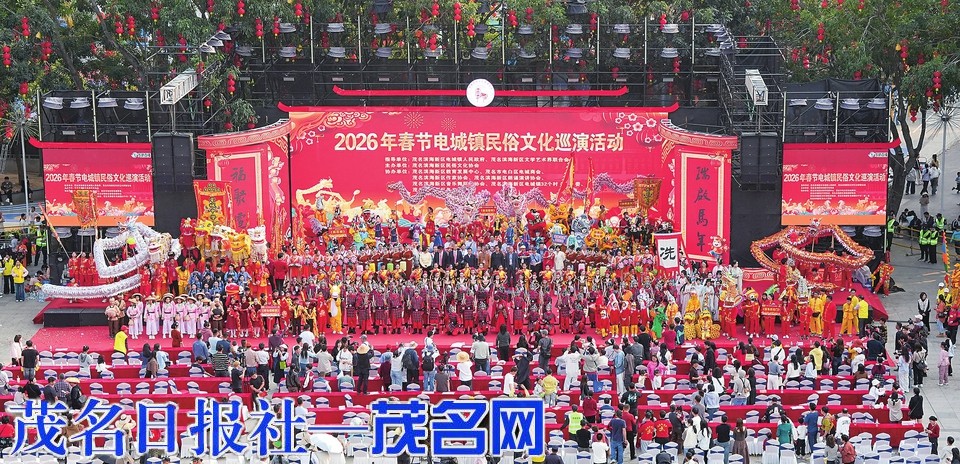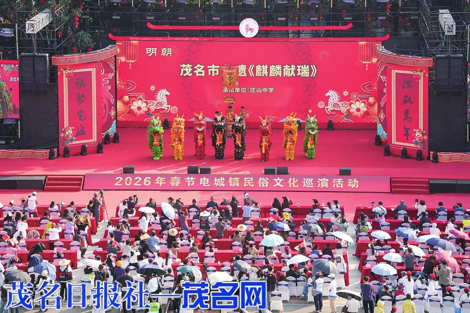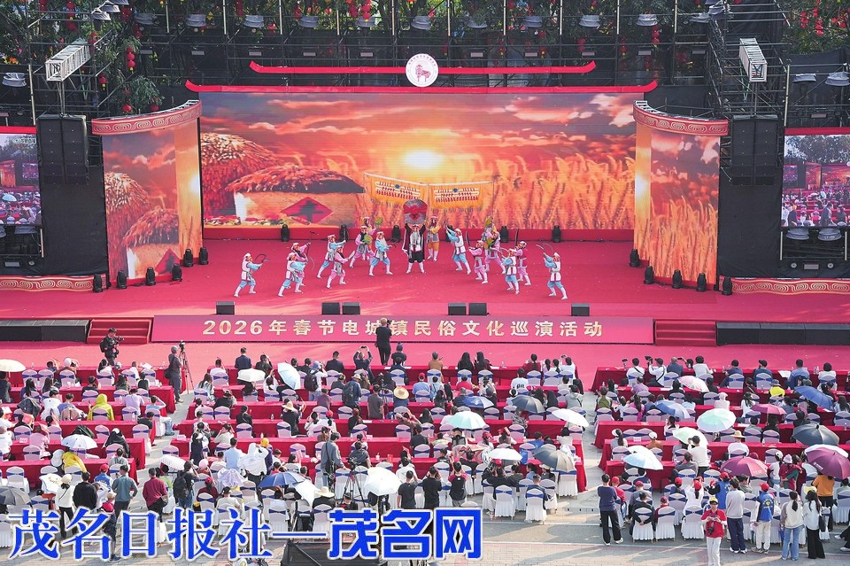 茂名滨海新区党工委委员、组织人事部部长,电城镇党委书记吴瑞勇在致辞中表示,电城镇民俗文化巡演自2024年恢复以来,已成为凝聚民心、传承文化、展示古城魅力的重要名片,是文化赋能“百千万工程”、丰富群众精神文化生活的生动实践。2025年6月,电城镇荣获茂名市推进实施“百千万工程”先进集体。春节前,“百千万工程”项目电城长安公园正式开园;栖凤路和城南路东延线相继通车。这场巡演,成为联结乡愁的温情纽带,让大家在民俗记忆中重温故土情深;成为展示魅力的文化平台,以民俗为媒、以文化会友,让八方宾客体验一个有底蕴、有温度、有活力的电城;成为砥砺奋进的序章,激励全镇以更加昂扬的姿态推进“百千万工程”。