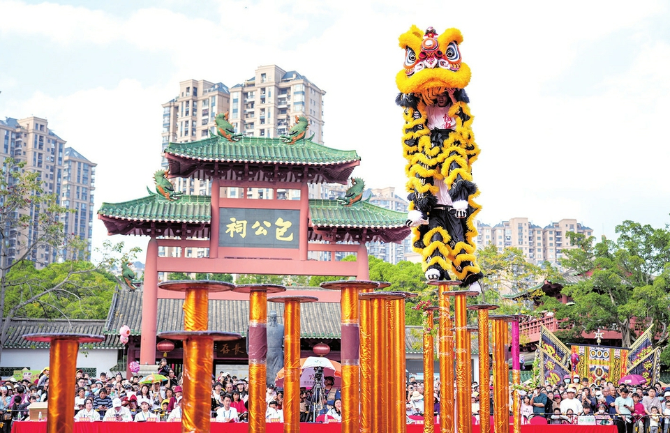 醒狮表演吸引众多游客观看。