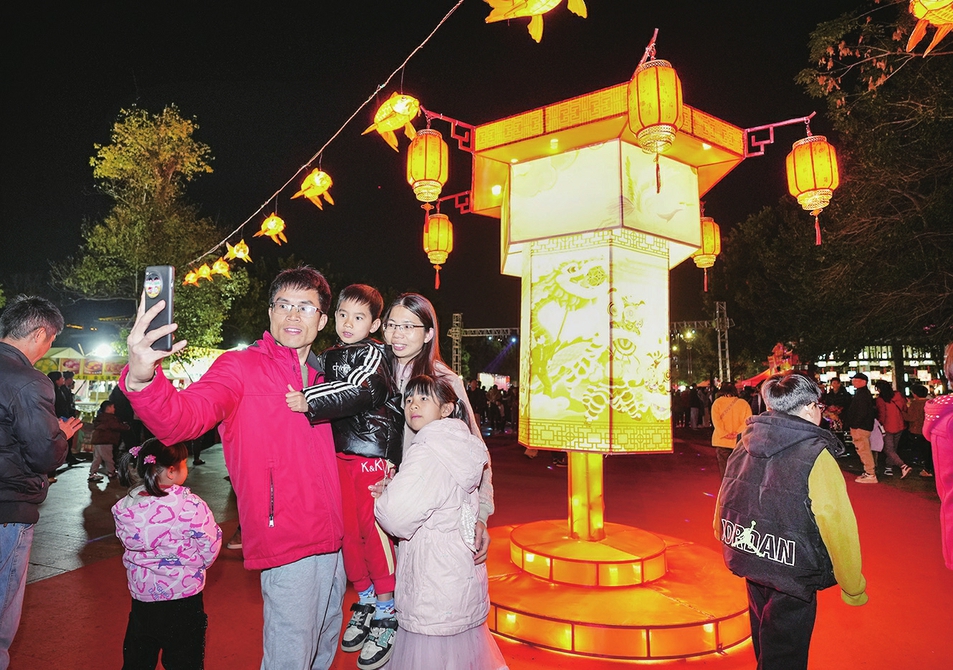 市民在花灯前留影。