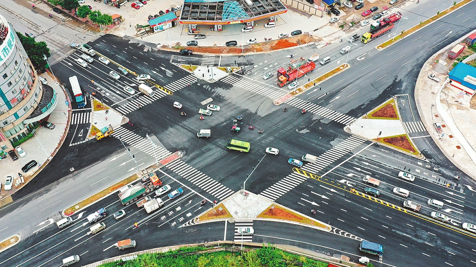 ⑤玉福路口渠化改造通车后,车辆有序通行。(玉林市融媒体中心记者 蒋金泰 摄)