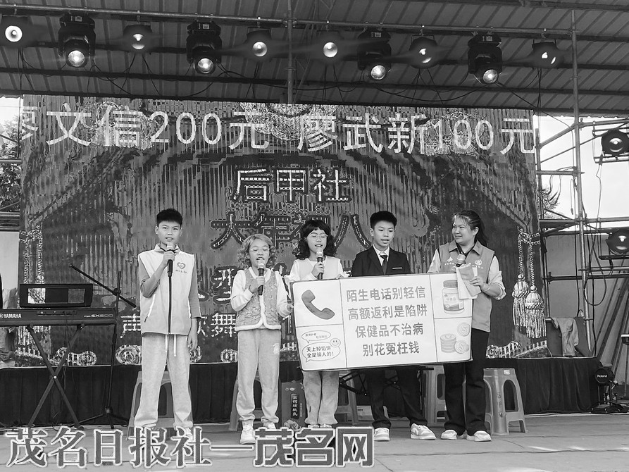 本报讯 年例盛宴添新彩,反诈宣传入人心。在高州市南塘镇后甲村热闹的年例大舞台上,一场以养老防诈骗为主题的小品《守住养老钱,安心享晚年》精彩上演(如右图),将乡村治理与反诈宣传融入年例民俗,以群众喜闻乐见的文艺形式,为现场千余名村民送上了一堂生动的防诈教育课,让反诈知识随年例年味浸润人心。