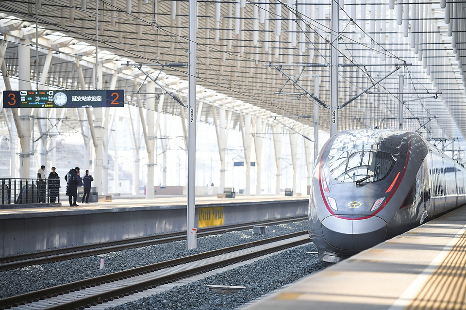 2025年12月26日,西安至延安高铁开通运营。至此,中国高铁运营里程突破5万公里。这是西延高铁首发列车从延安站驶出。 新华社记者 张博文 摄