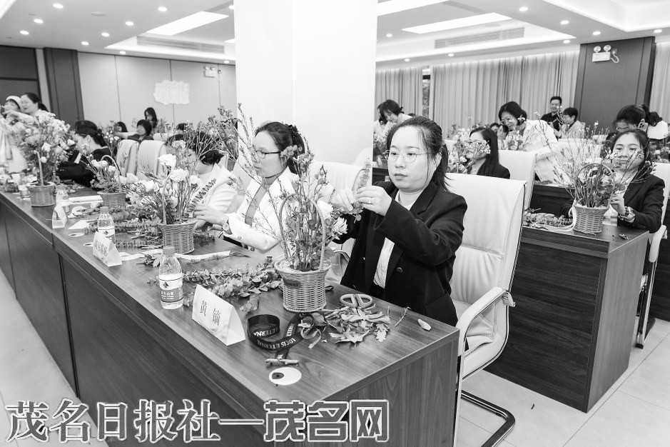 活动还特别邀请了见心花道·茂名四季插花非遗传承人赵凤英到场教授插花技艺,让在场女性在花香浸润中舒缓身心,在一枝一叶的构思中感受非遗魅力。