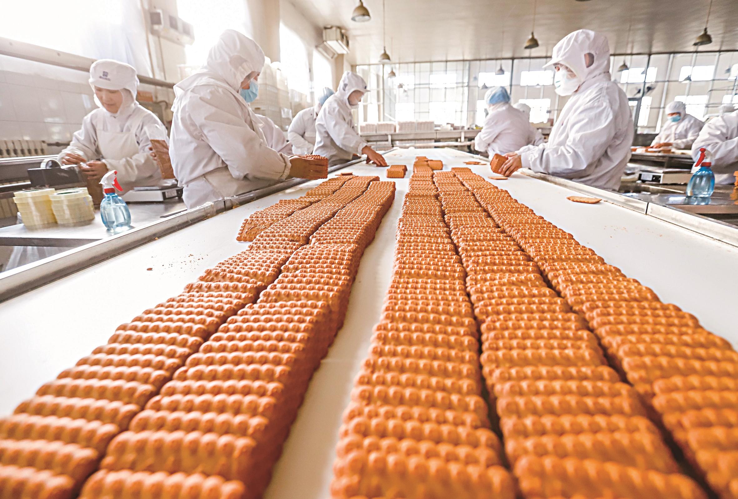 1月2日,工人在河北省遵化市崔家庄镇一家食品加工企业饼干生产车间工作。
