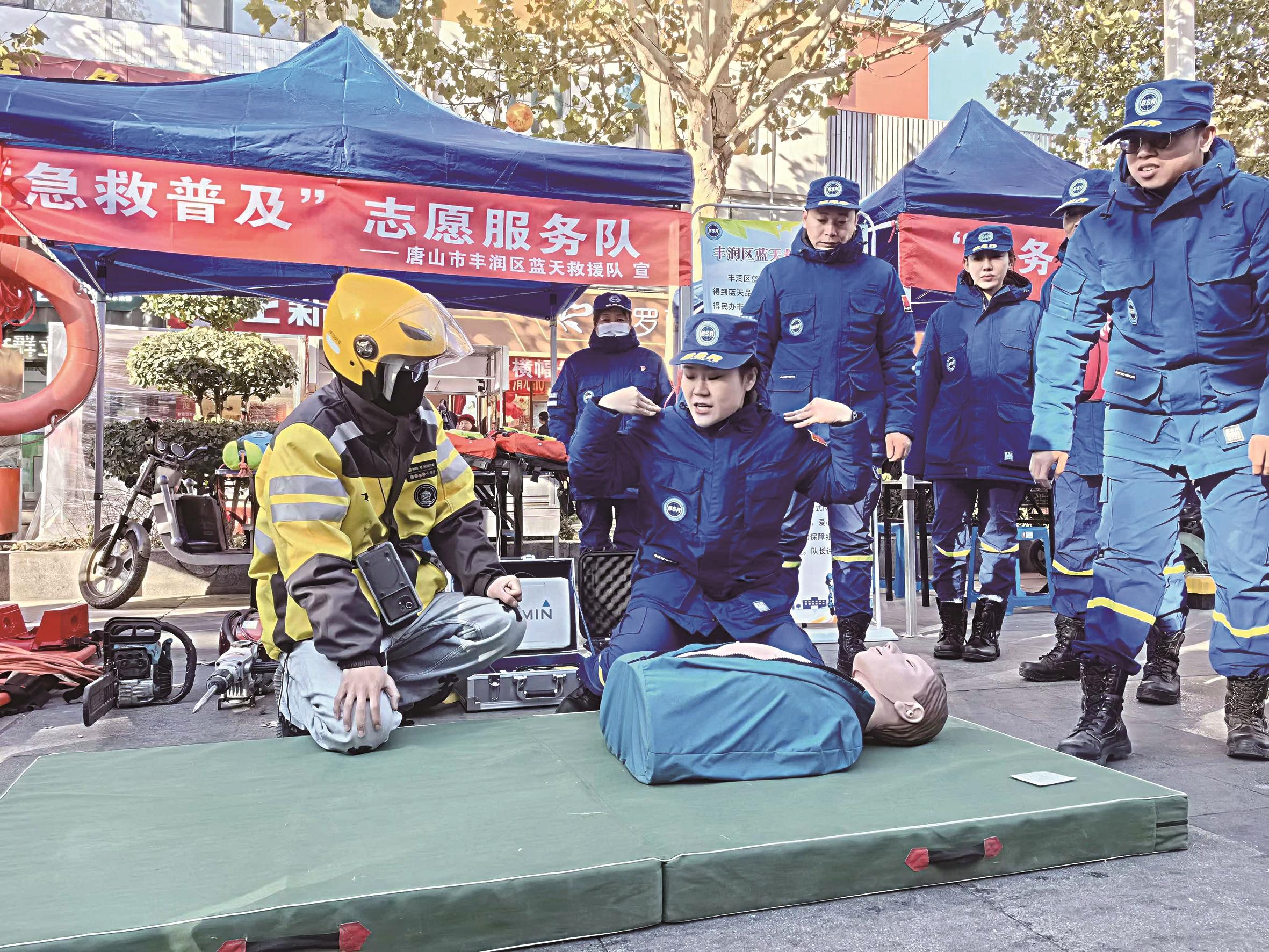 在“急救普及”志愿服务现场,丰润区蓝天救援队志愿者现场传授心肺复苏、人工呼吸等紧急抢救知识,现场中小学生、“外卖小哥”等纷纷认真学习并现场演练,志愿者和群众互动热烈。“点亮微心愿”“职业帮扶”“反诈宣传”“心理咨询”等主题志愿服务活动现场,同样聚集了不少群众……