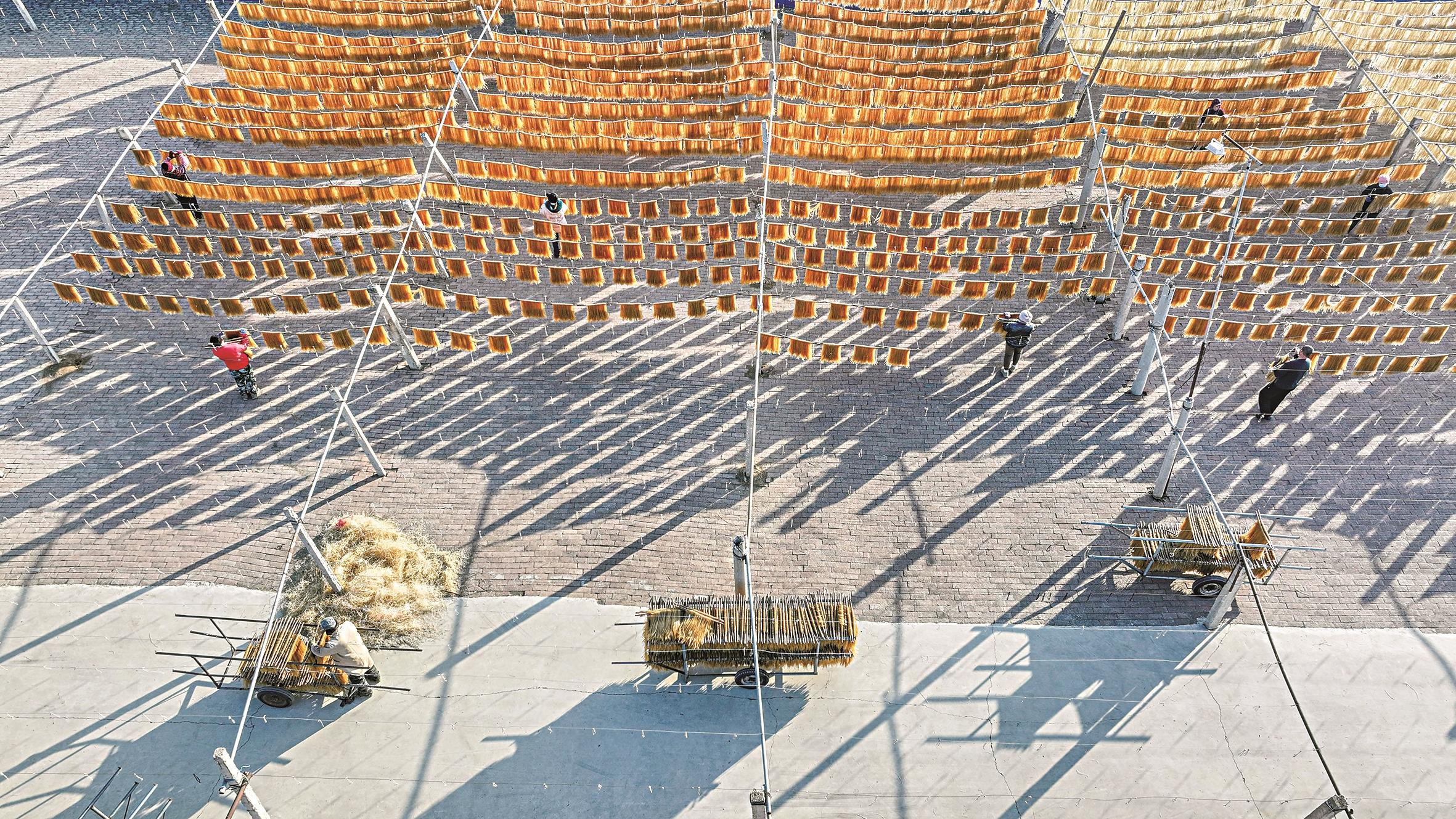 1月5日,农民在河北省遵化市一家粉条加工专业合作社的场院晾晒粉条(无人机照片)。