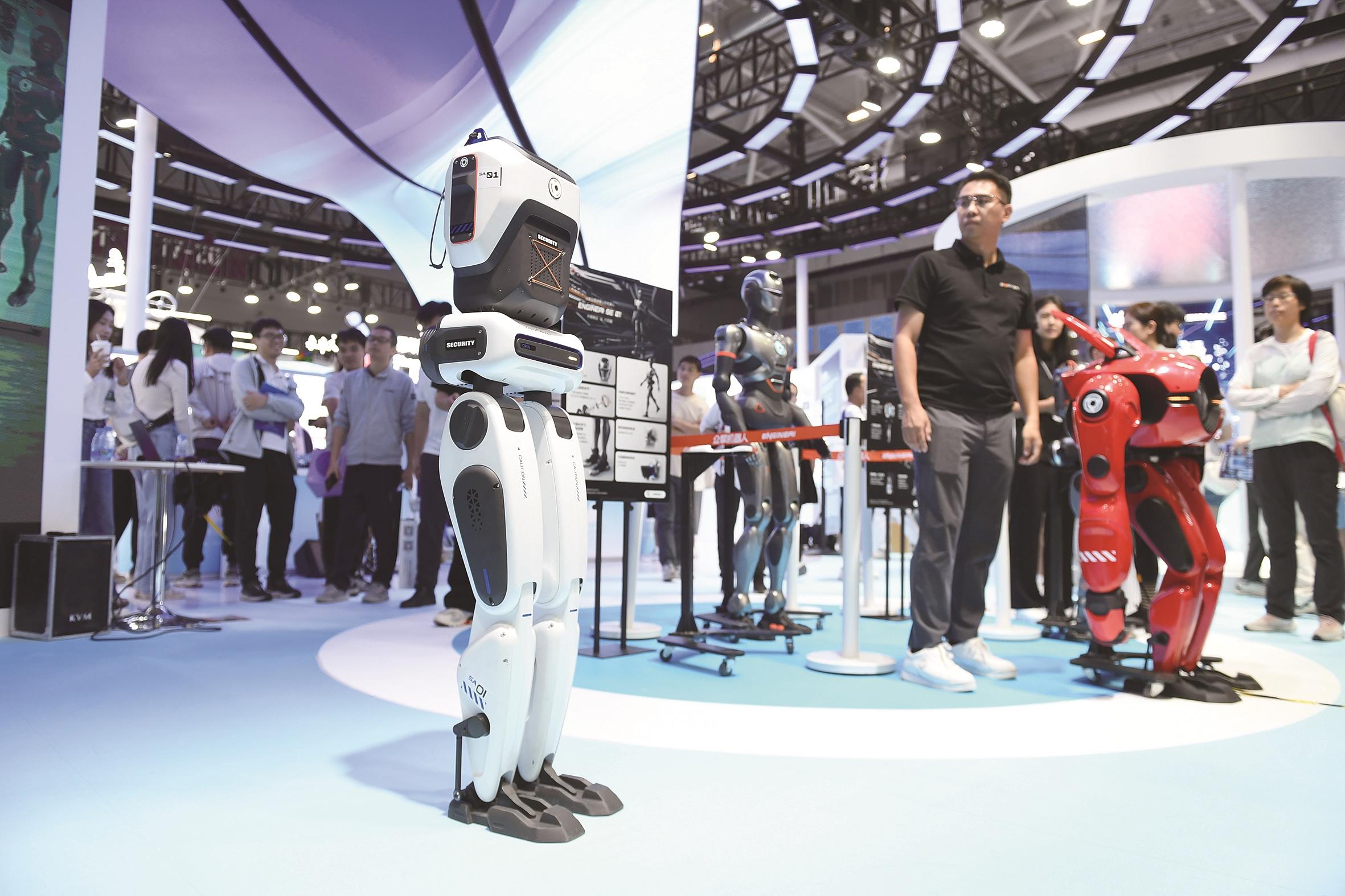 在深圳举行的第二十六届中国国际高新技术成果交易会上,深圳市众擎机器人科技有限公司展示双足机器人SA01的行走能力(2024年11月14日摄)。新华社记者 毛思倩 摄