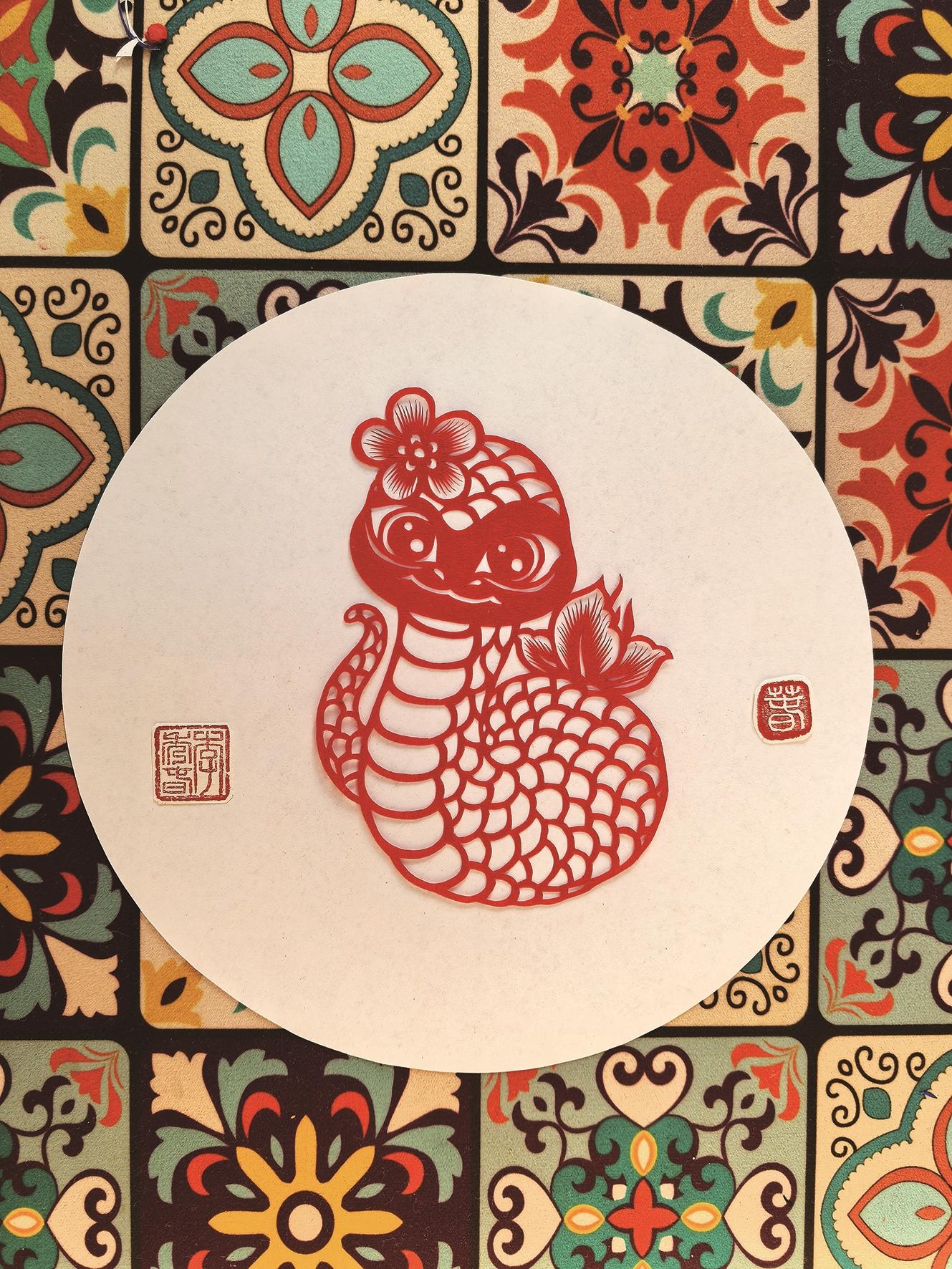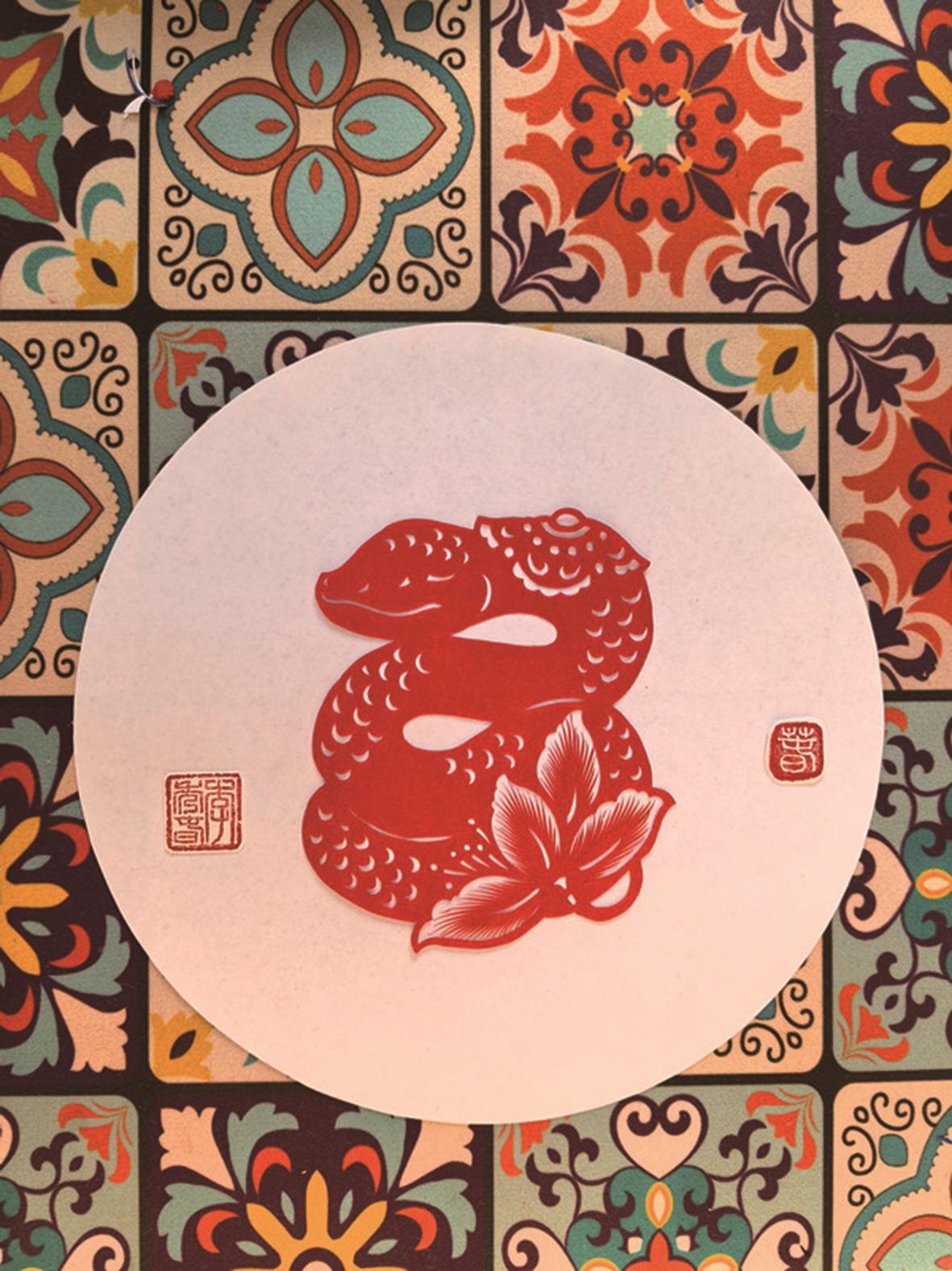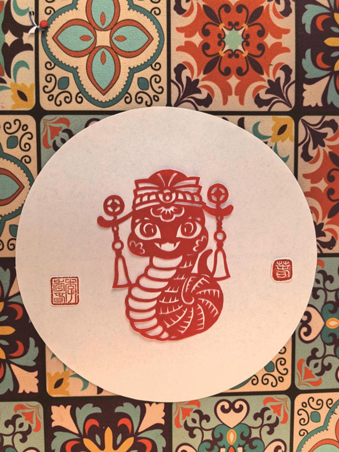 流传于民间的一些和蛇有关的谜语,非常生动形象,有的寥寥片语,就把蛇的特征刻画出来,此类“蛇”谜,颇适合儿童猜。如:“高山上一盘磨,人人走来不敢坐”“草中一根绳,弯弯曲曲行,猴子看见就躲开,青蛙看见没性命”“无脚也无手,身穿鸡皮皱。谁若碰着它,吓得连忙走” “每隔数日脱旧衣,没有脚爪走得急,攀缘树木多轻便,光滑地面步难移”…… (本文剪纸 李秀春)