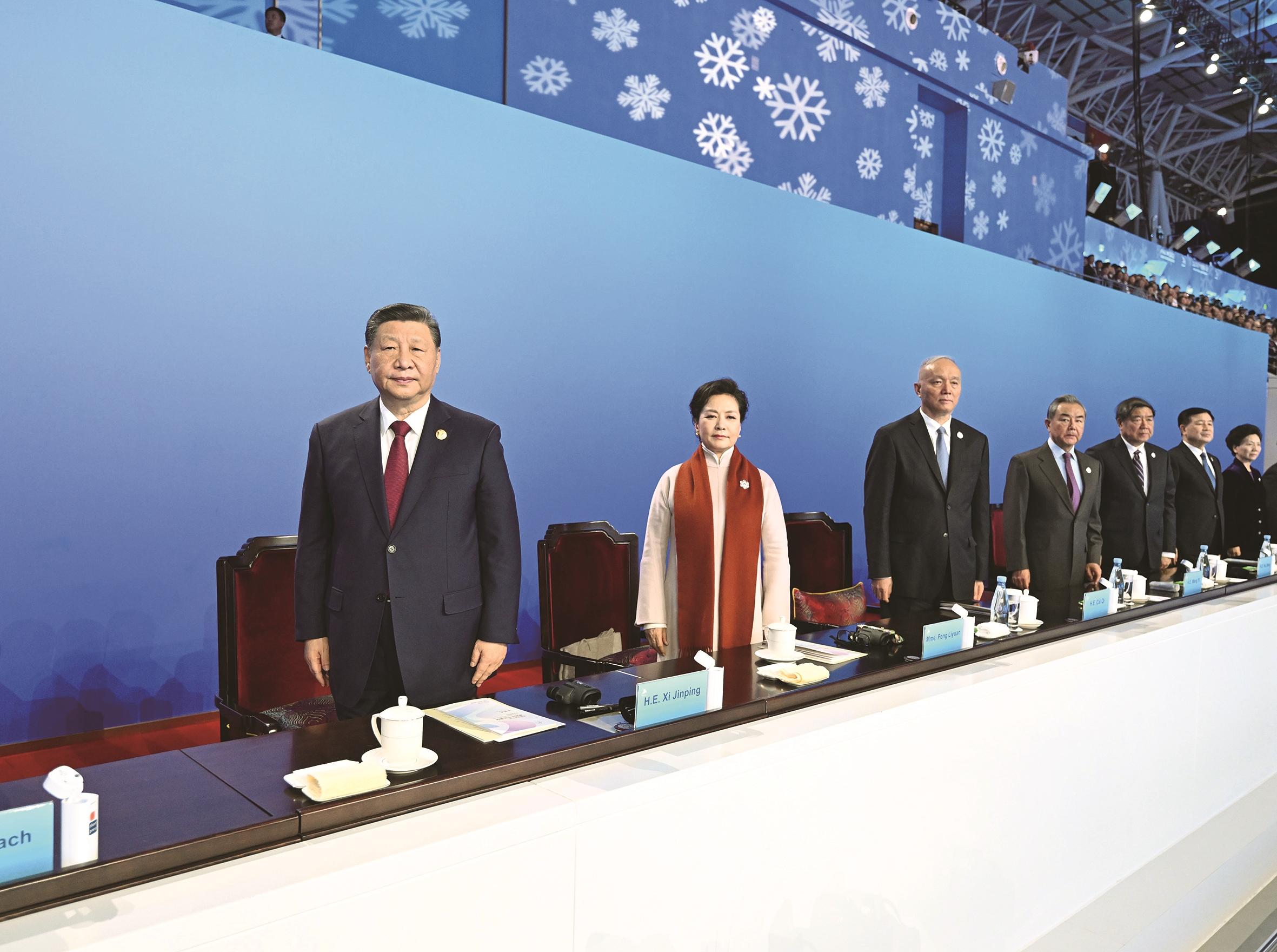 19时58分,在《和平——命运共同体》的乐曲声中,习近平和夫人彭丽媛,同国际奥委会主席巴赫、亚奥理事会第一副主席霍震霆等步入主席台,向观众挥手致意。全场响起长时间的热烈掌声。