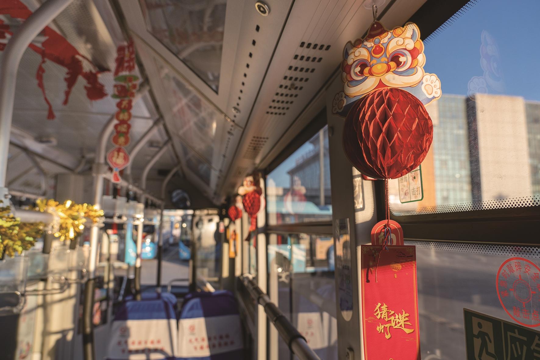 元宵佳节将至,市交发集团对运营车辆进行主题装饰,红灯笼串起节日祝福,剪纸窗花映衬生肖图案,让乘客在出行途中感受团圆氛围。