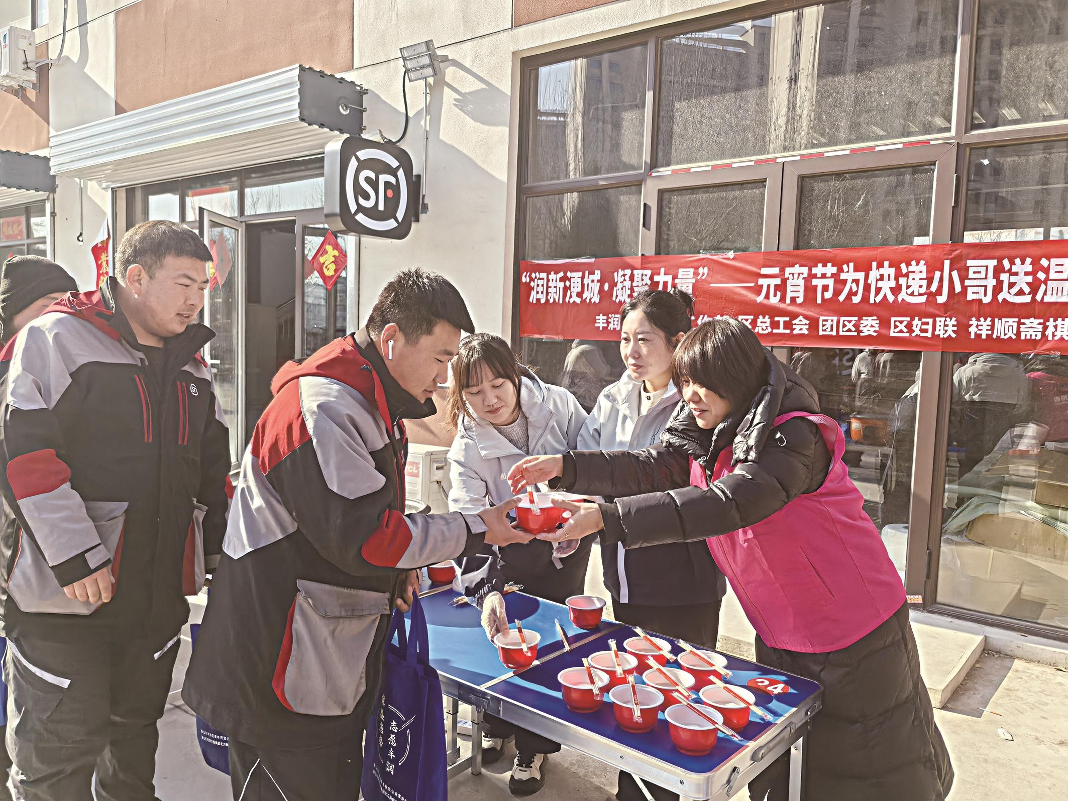 2月10日,丰润区委社会工作部、区总工会、团区委、区妇联、祥顺斋餐饮服务有限公司联合开展“润新浭城·凝聚力量”——元宵节为快递小哥送温暖活动,为顺丰速递、圆通速递、京东快递等快递公司120多名快递小哥送去代表团圆的元宵,让快递小哥感受到社会的温暖。