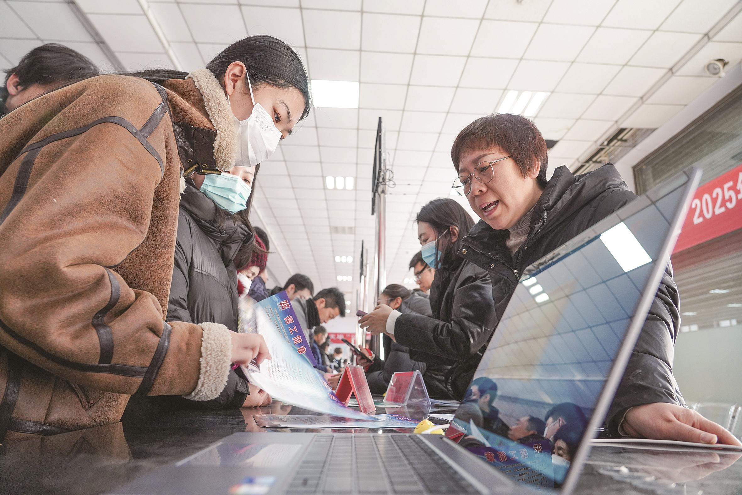 2月11日,在河北省唐山市滦南县“春风送岗促就业 精准服务暖民心”招聘会现场,工作人员向求职者介绍岗位信息。