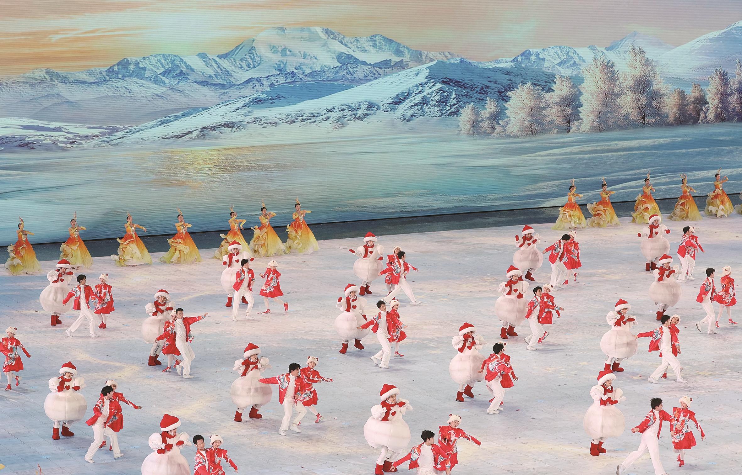 舞台上,当现场舞者与虚拟乐团交相呼应,闭幕式演出震撼开场。身穿橘黄纱裙的舞者翩然,宛如冰凌花朵朵绽放。可爱的“雪人”舞动全场,仿佛雪山的精灵带来捷报。