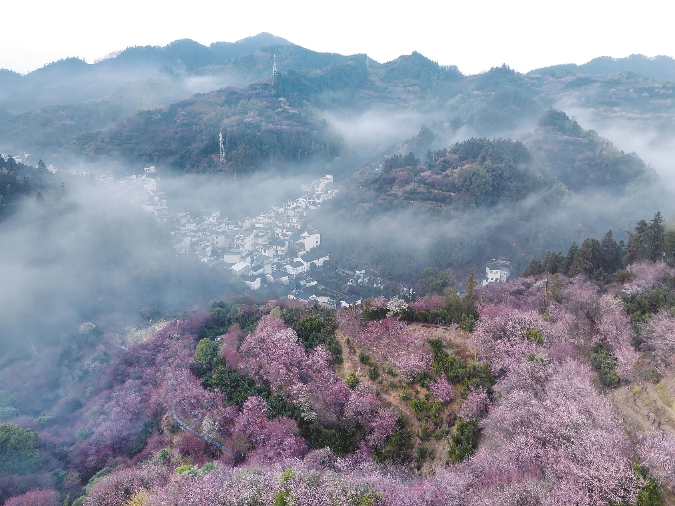 早春时节,卖花渔村周边漫山绽放的梅花与徽派村落民居相映成趣,景美如画,吸引游客踏春赏花。 新华社发(樊成柱 摄)