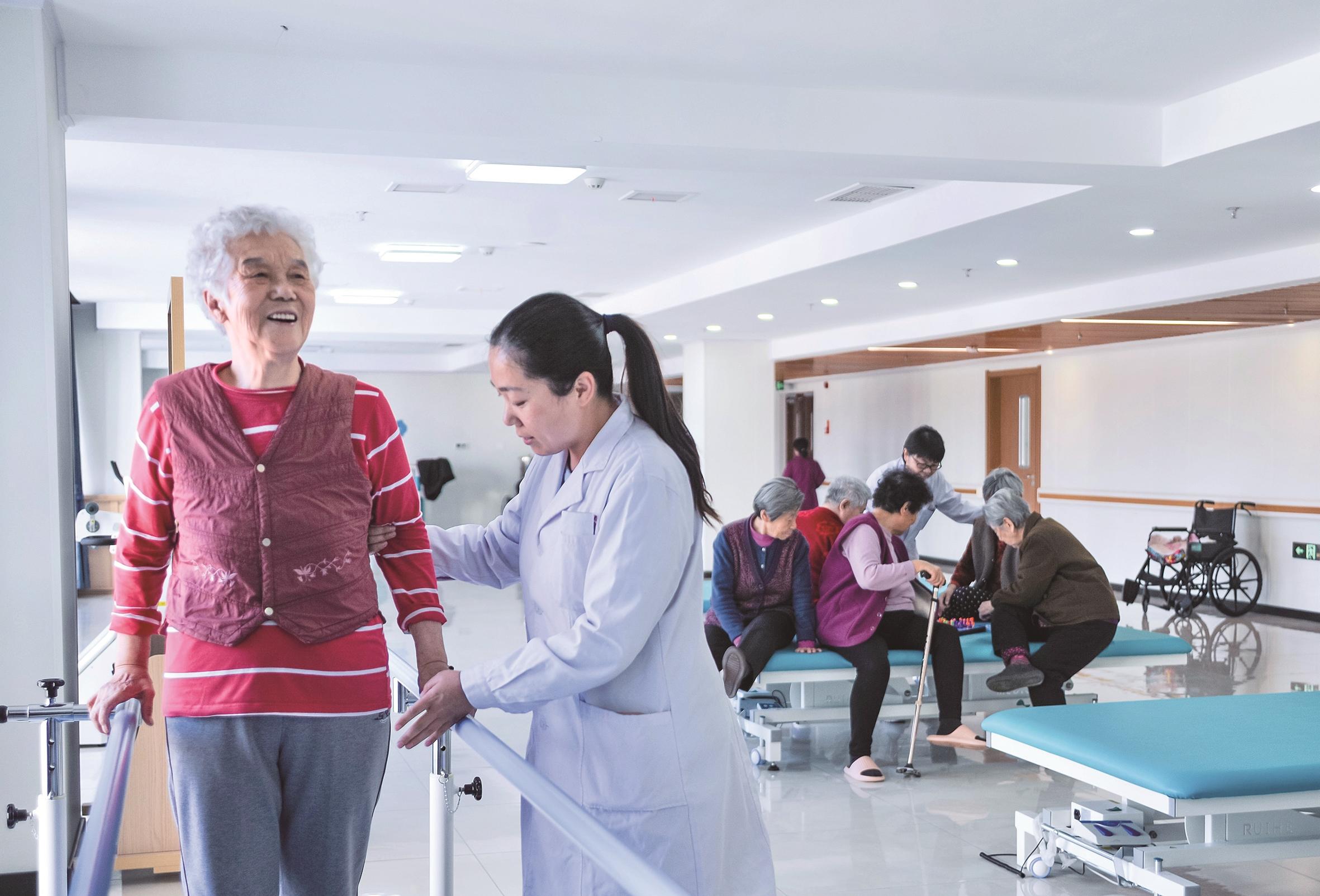 图为路北区福瑞达养老护理院护理员们正在陪护老人们健身休闲。