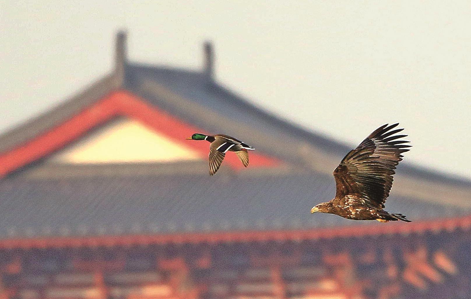 日前,一只亚成体白尾海雕在南湖公园飞翔的画面被生态摄影师捕捉到镜头中,这是近年来该地区首次发现国家一级保护动物白尾海雕在此越冬。进入冬季以来,南湖迎来了一批批特殊的“客人”——越冬野鸟。据最新观测数据显示,共有90种野鸟选择在此度过寒冬,这里俨然成了它们的乐园。