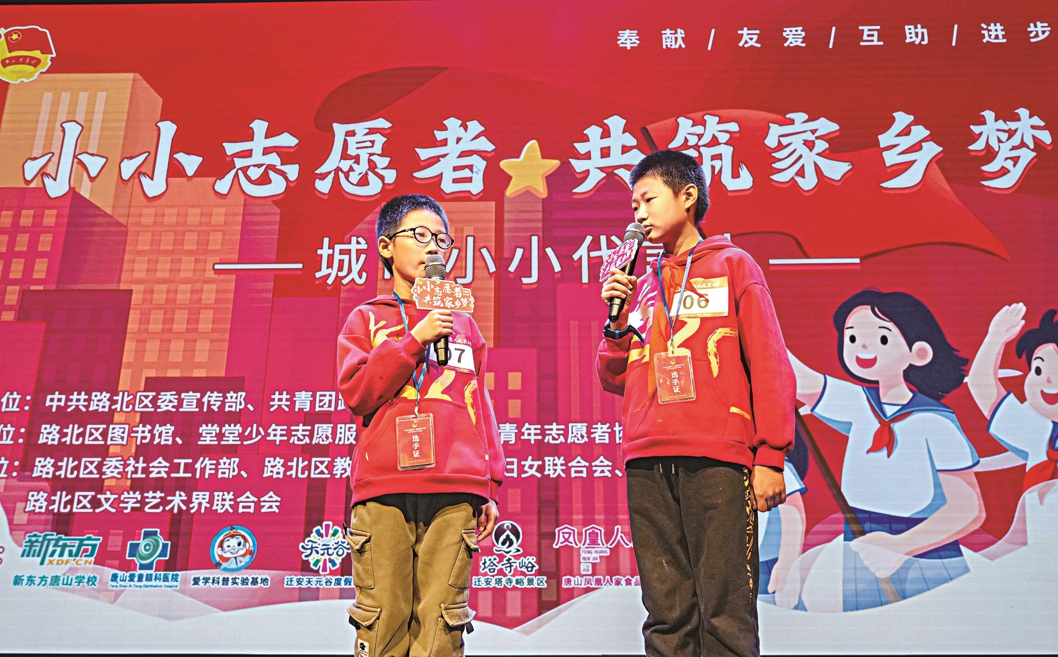 在第62个“学雷锋日纪念日”来临之际,3月2日,共青团路北区委联合区委宣传部、区图书馆、堂堂少年志愿服务队等多家单位共同举办“小小志愿者 共筑家乡梦”主题宣讲活动,近200名观众到场观看。 该宣讲活动自启动以来,260名小小志愿者经过初选考核、街头路演、专业培训、复选打磨,31名脱颖而出的少年将他们的志愿故事带到活动现场,为家乡代言。 图为凤凰小学学生正在进行主题宣讲。 本报记者 徐慧 摄