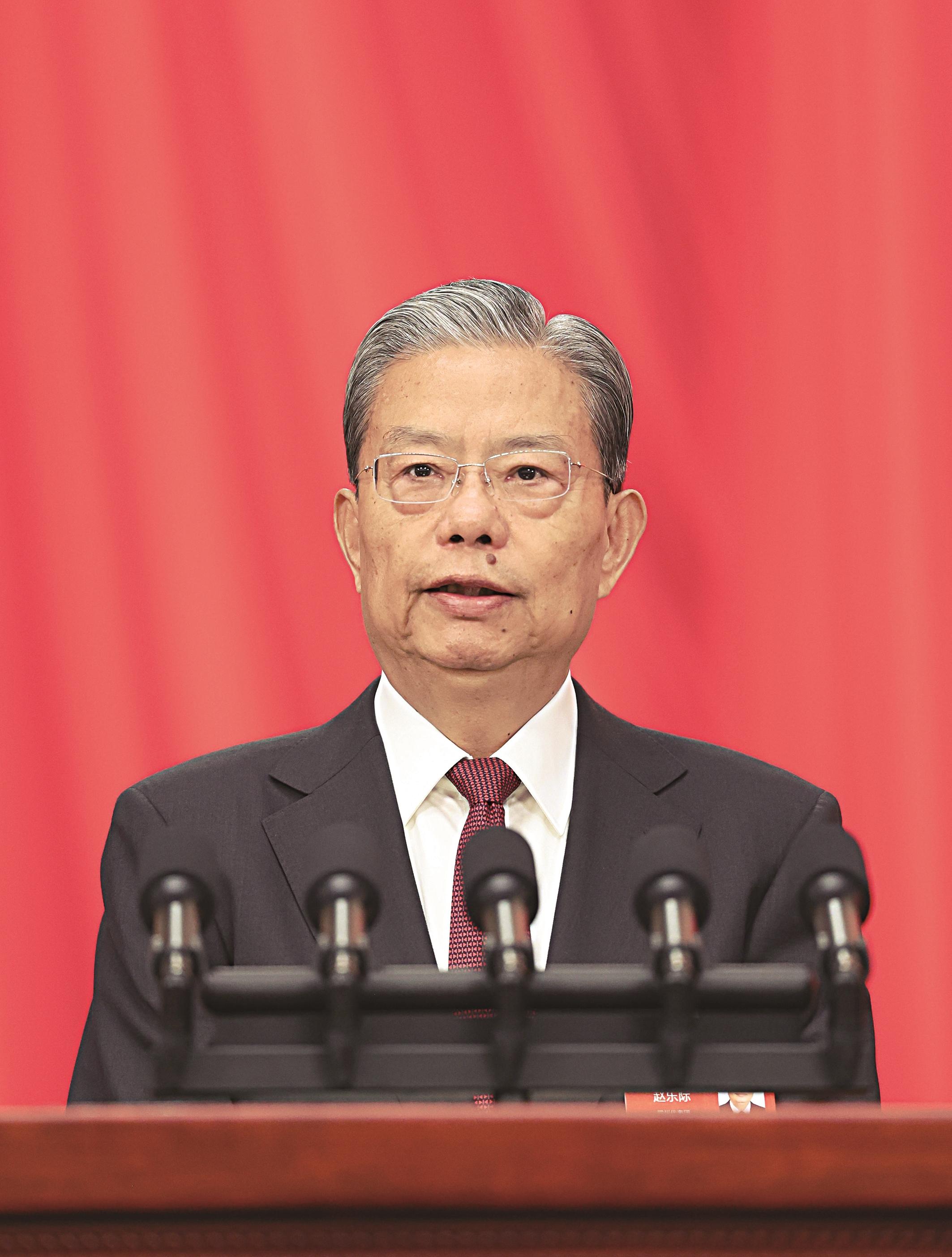 3月8日,十四届全国人大三次会议在北京人民大会堂举行第二次全体会议。受全国人大常委会委托,赵乐际委员长向大会报告全国人大常委会工作。新华社记者 丁海涛 摄