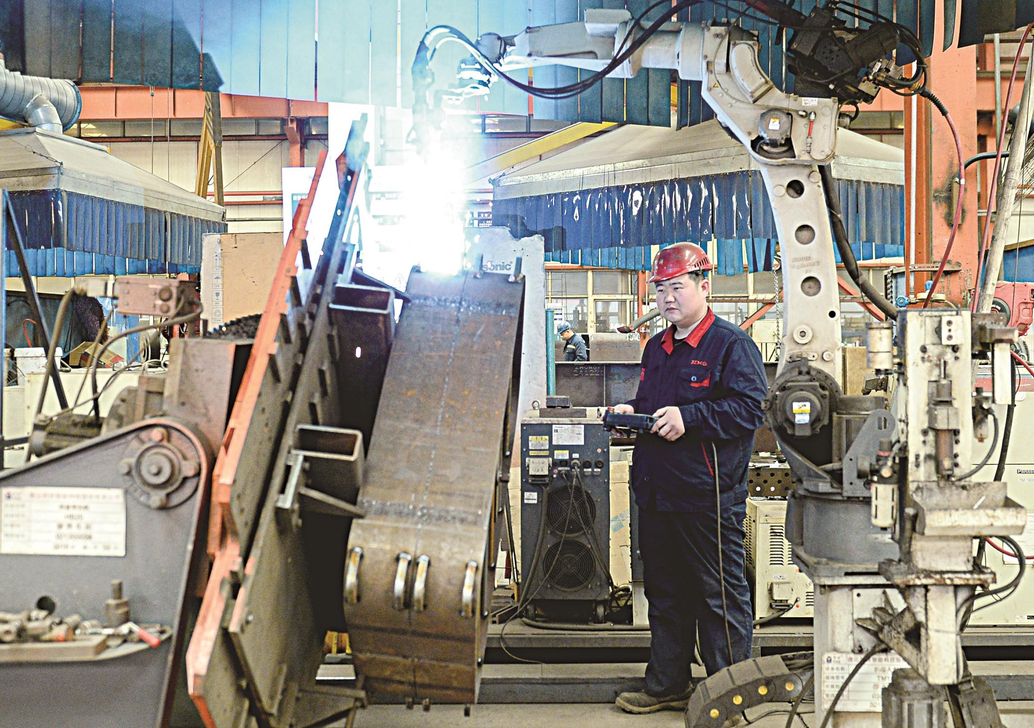 3月14日,在丰南区大新庄镇贺祥智能科技公司铆焊车间内工作人员正在操纵机器人进行焊接作业。据了解,该公司是一家集卫生陶瓷机械设计研发、生产制造、安装调试、技术服务为一体的科技创新型企业,是全国首批专精特新“小巨人”企业、国家级高新技术企业,拥有专利536项,其中发明专利52项,产品出口58个国家,1-2月销售额1932万元。