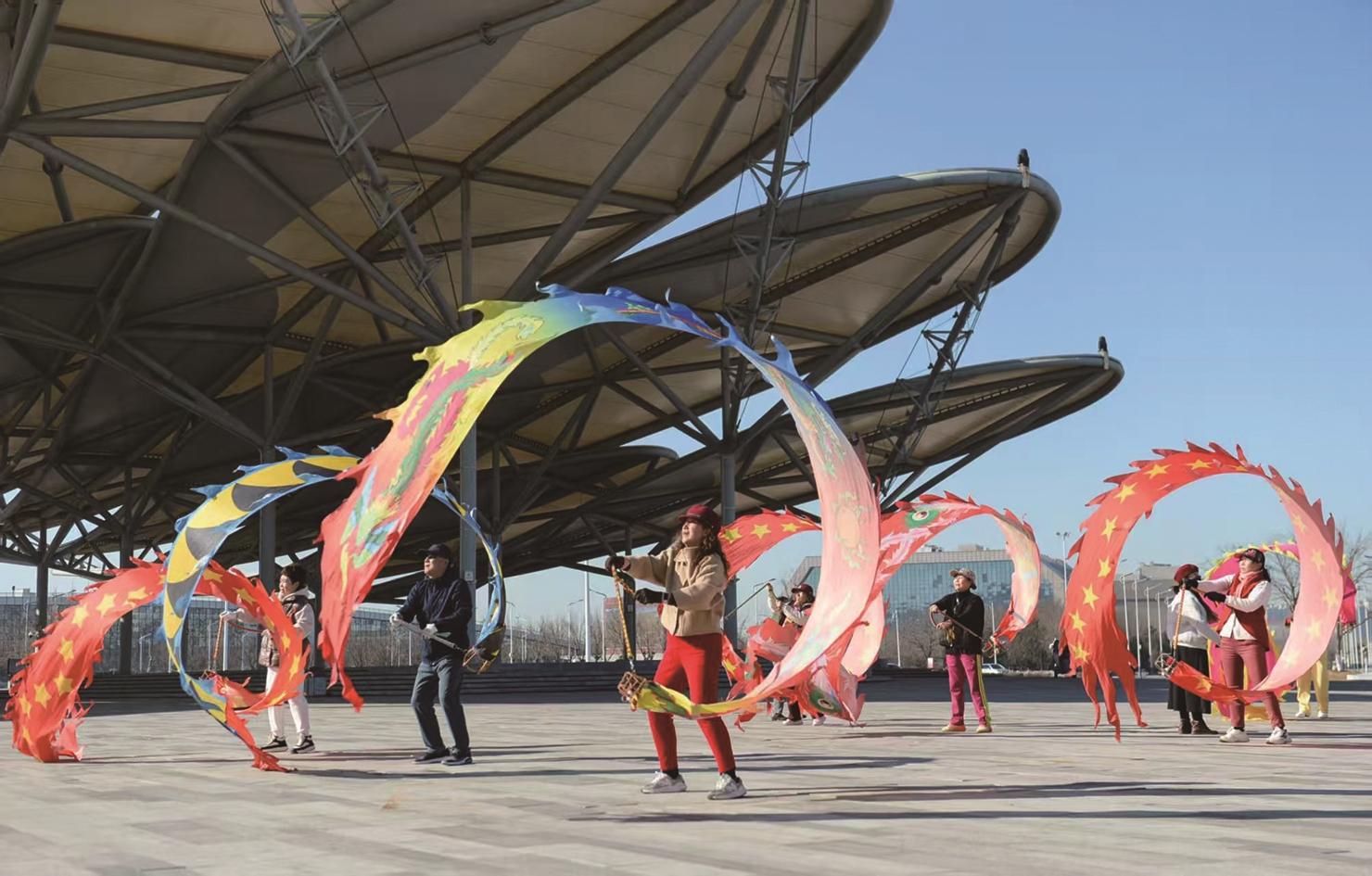图为南湖旅游景区世园广场,市民们用舞龙的方式健身运动,体验暖阳时光。