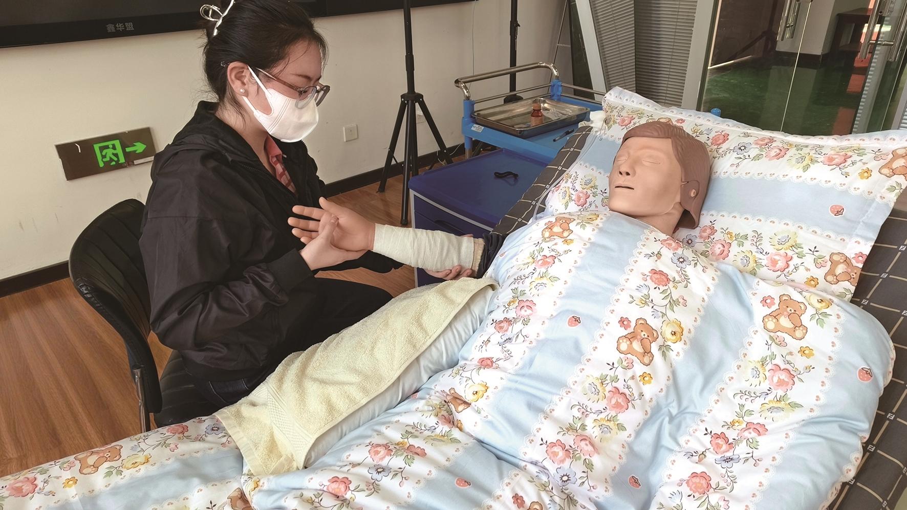 ?参赛选手刘奕可在集训练习中为受照护人员进行手部绷带包扎。 李佳芮 摄