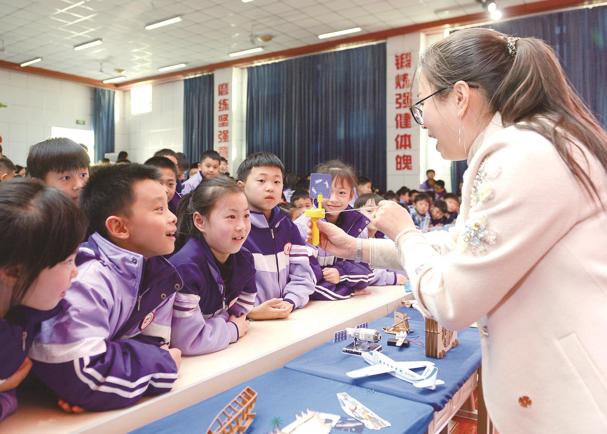 图为老师通过模型展示为学生们讲解构造及原理。