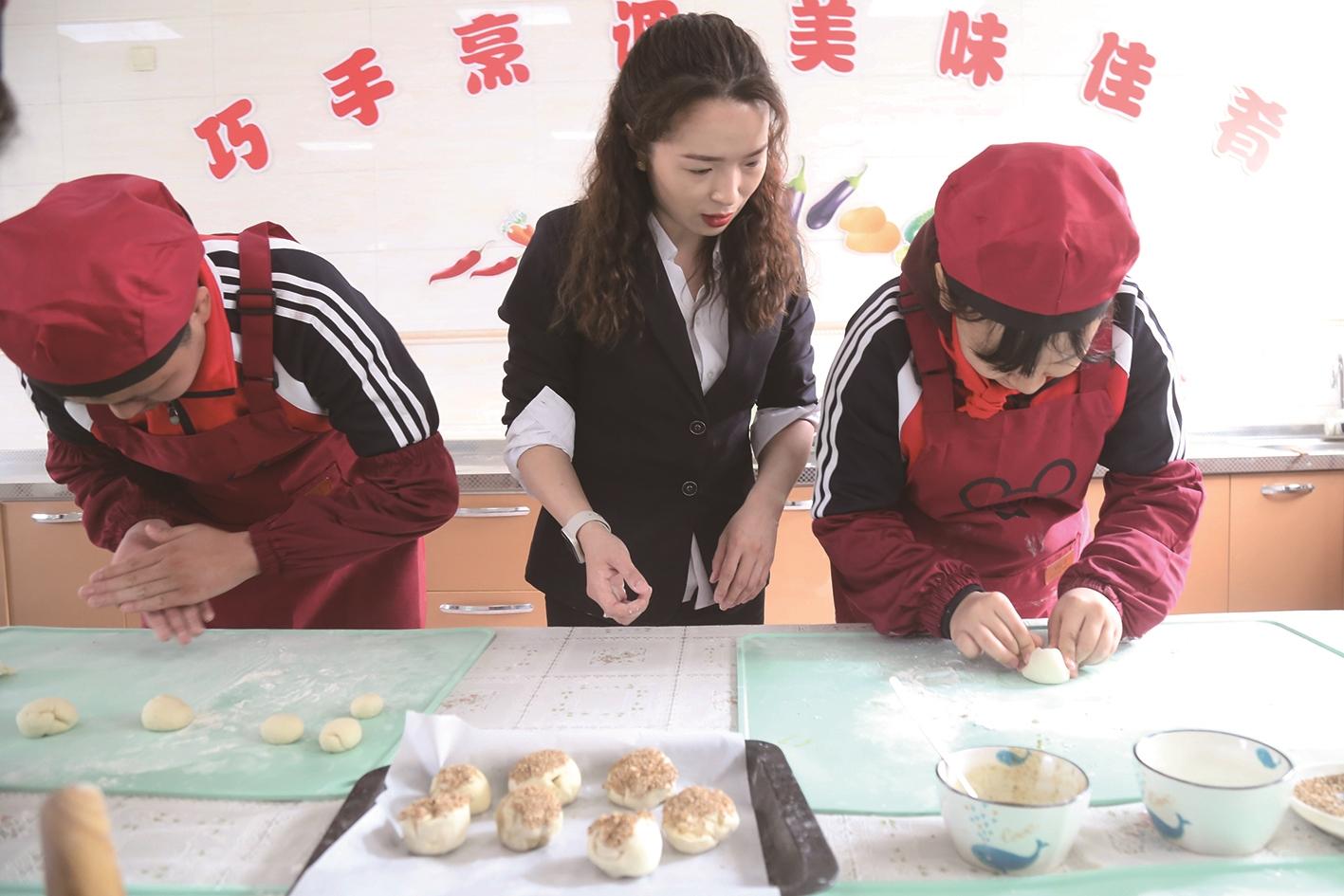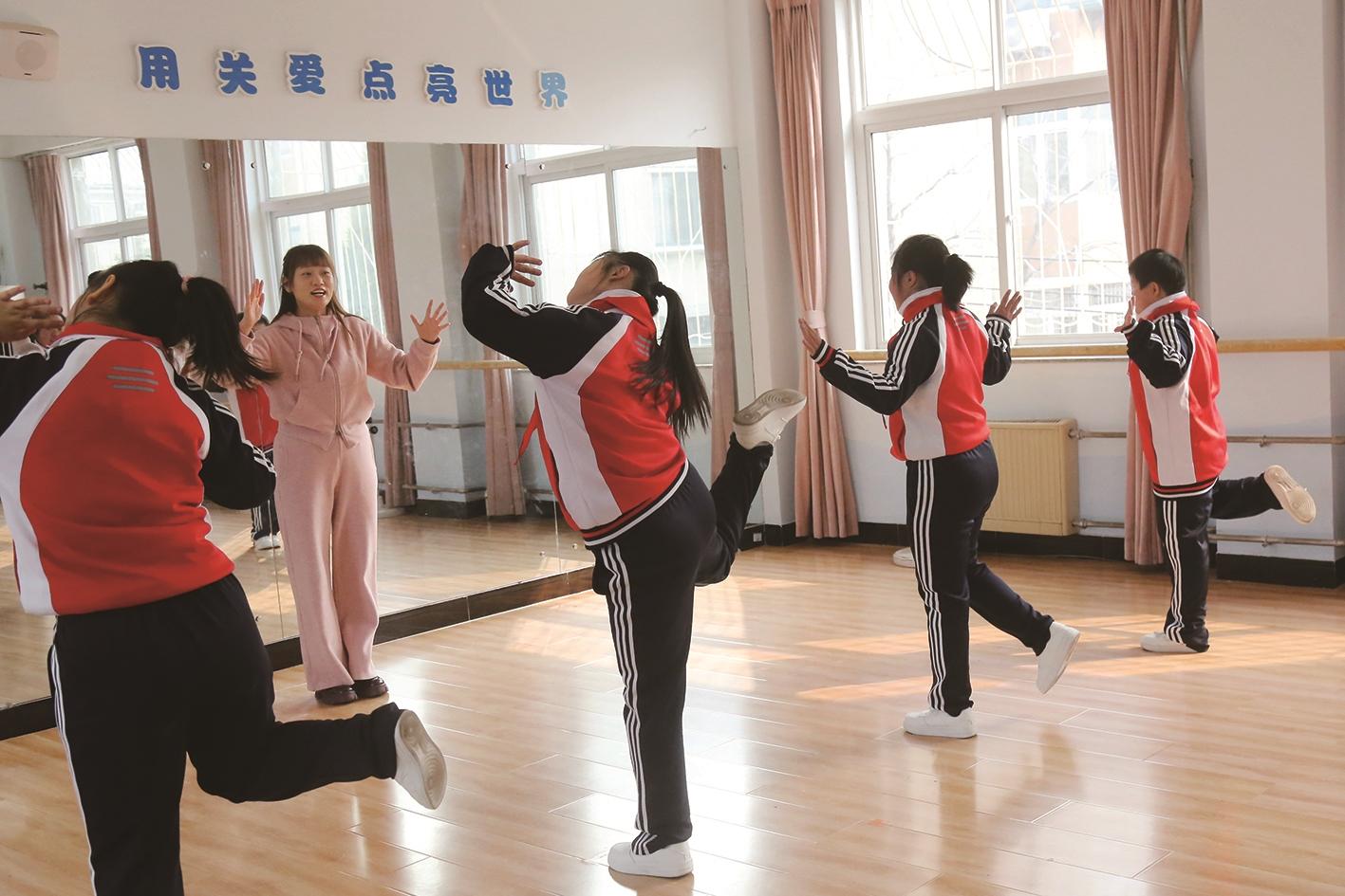 ▲美食少年在老师的指导下制作烧饼。 ?培智学校舞蹈老师在教授孩子舞蹈。 记者 刘大民 摄