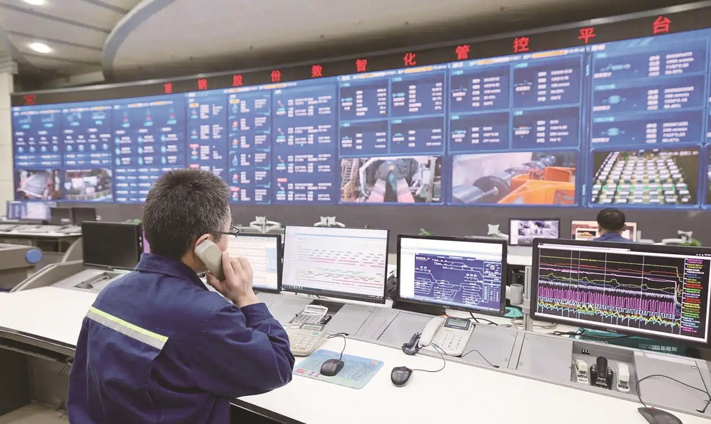 记者在位于河北省迁安市的首钢迁钢公司调度指挥中心看到,巨大的主控屏幕上各类数据不停滚动,工作人员在各自机位上协同对厂区超过60个生产工序进行数字化管控。