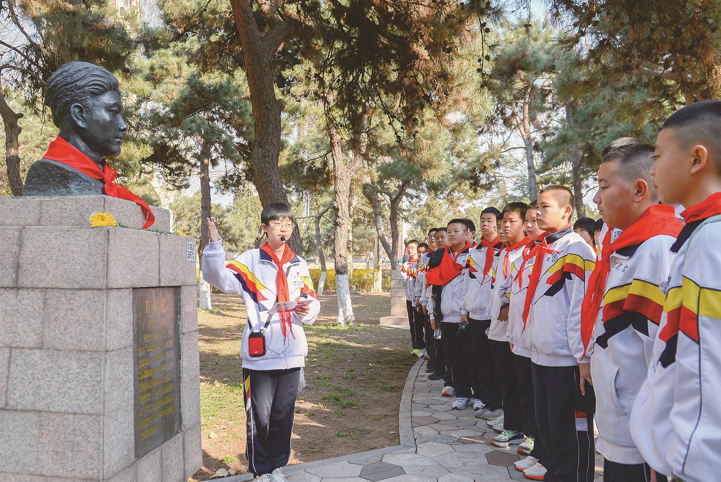在大钊公园,唐山交大实验学校师生们深情朗诵李大钊先生的《青春》,学生代表以《信仰的丰碑》为题,讲述李大钊的故事,少先队员们昂首挺胸,齐声高唱《中国少年先锋队队歌》,让百年前播撒的信仰火种在新时代青春脉搏里焕发生机。