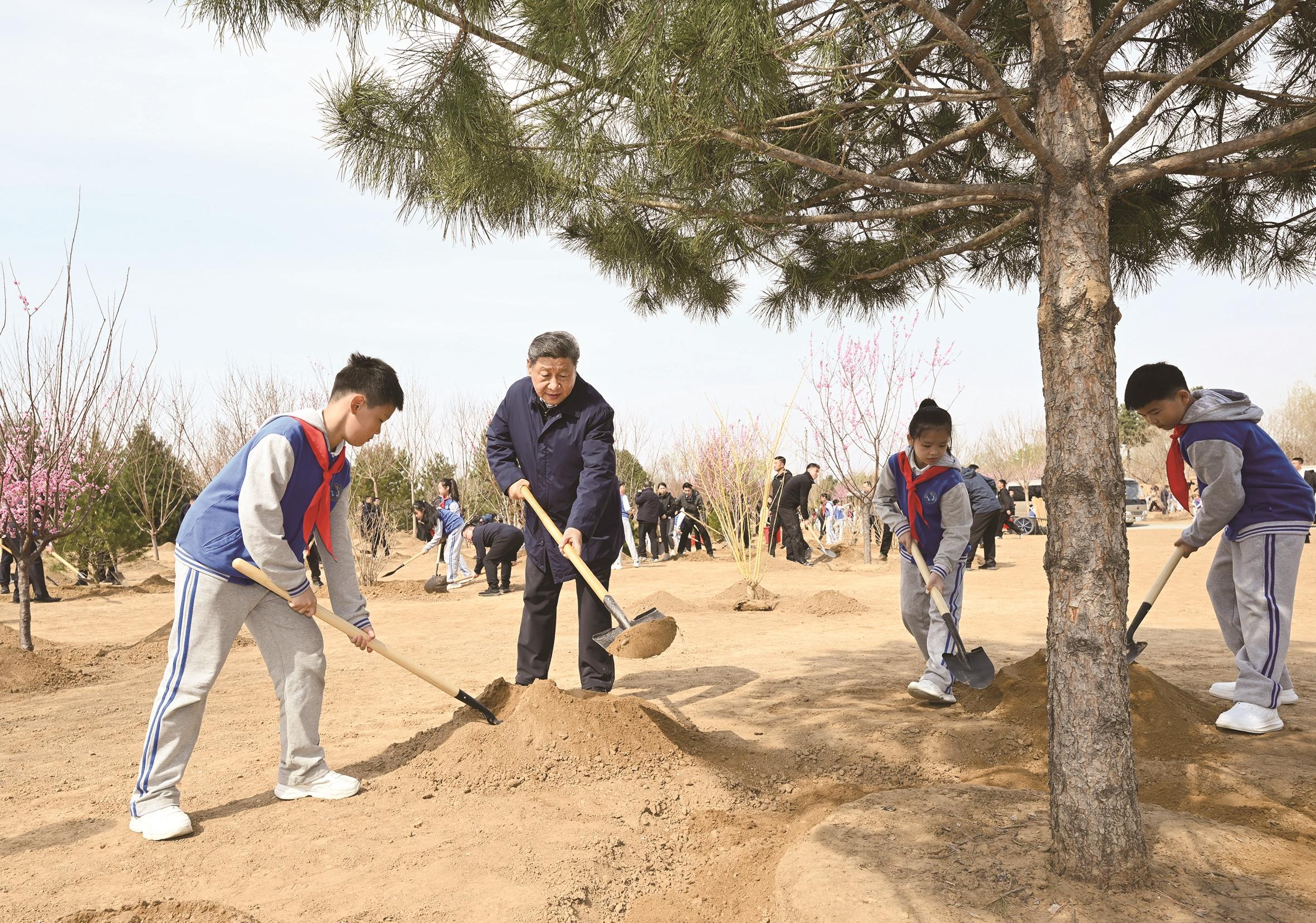 铲土造坑、培土围堰、提水浇灌……习近平接连种下油松、金枝槐、美人梅、车梁木、杜仲、元宝枫等多棵树苗。习近平一边劳动,一边询问孩子们的学习生活和劳动锻炼情况。他强调,美好生活都是靠劳动创造出来的,广大青少年要热爱劳动、热爱大自然,积极参加植树造林等公益活动,在劳动中锻炼身体、锤炼意志、增长知识,做到德智体美劳全面发展。植树现场气氛热烈,一派繁忙景象。
