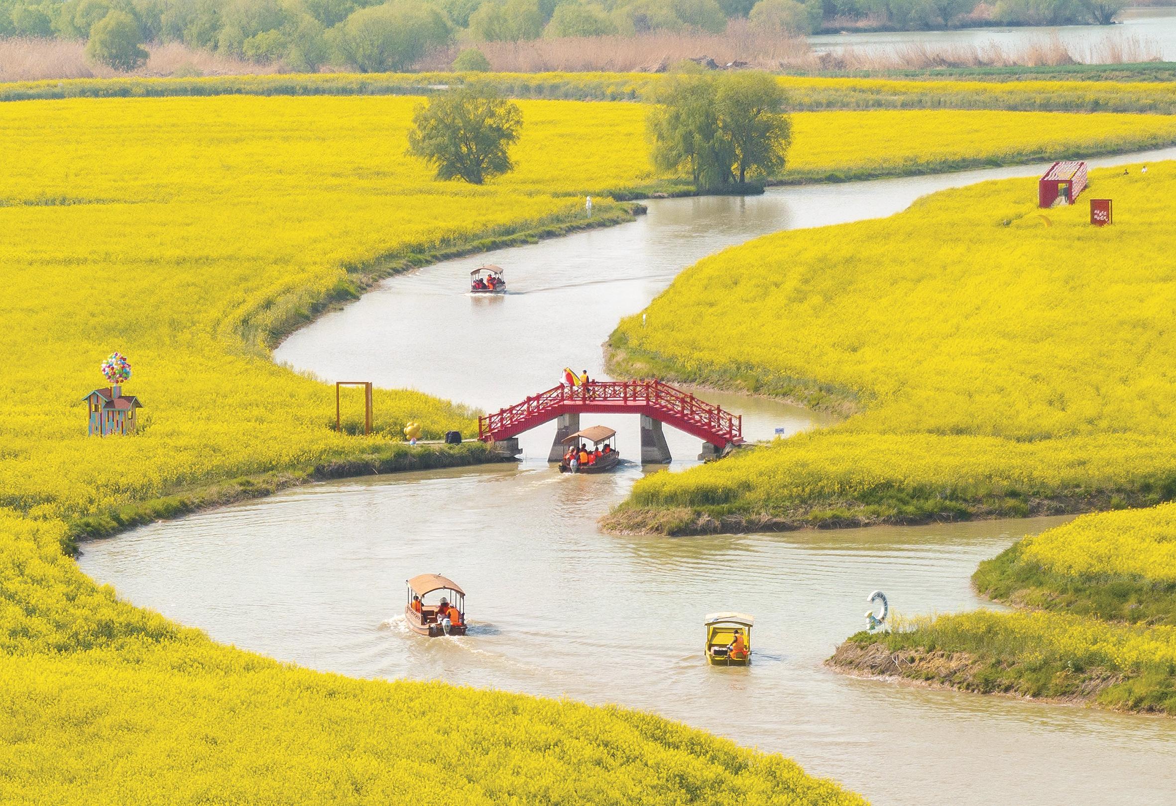 4月3日,游客在江苏省高邮市湖上花海景区赏花游玩(无人机照片)。